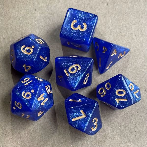 Each die is crafted from transparent resin and swirled with two shades of blue, creating a beautiful layered effect that adds depth and movement. A fine glitter finish brings extra visual flair without overwhelming the colour, while clear golden numbering ensures excellent legibility at a glance.