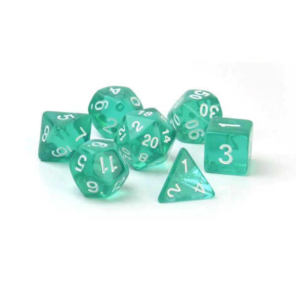 Lake Green Transparent Clear Polyhedral Dice Set for D&D and Tabletop RPGs, featuring coloured transparent resin with crisp white numbering.