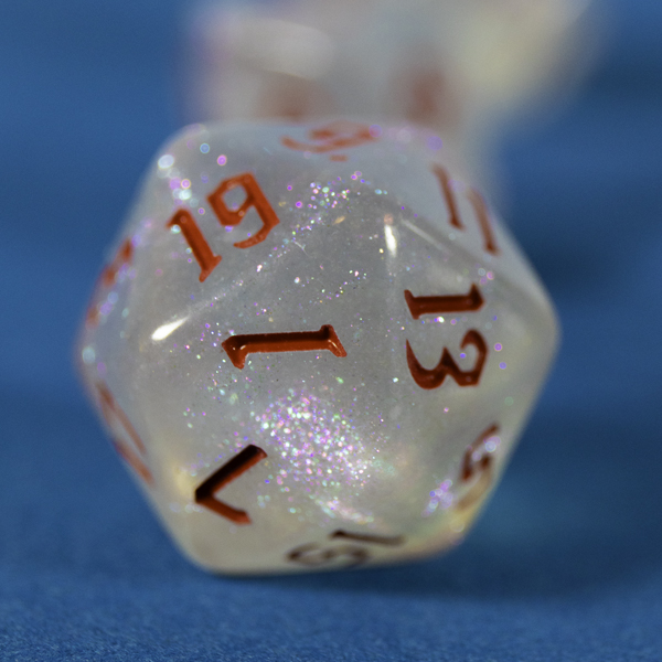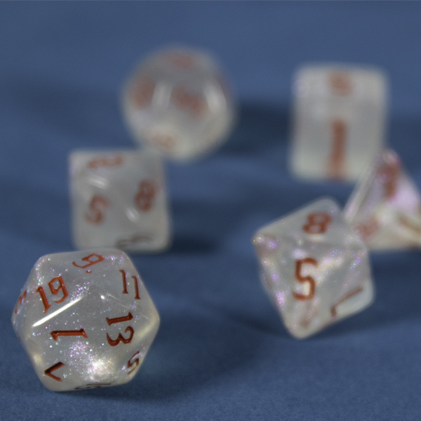 Crafted from crystal-clear resin with a soft transparent white base, these dice are infused with ultra-fine glitter that catches the light like stardust. The result is a clean, ethereal shimmer that’s perfect for healers, spellcasters, divine champions, or anyone who wants a little enchantment in their toolkit. The lettering on these dice is in red ensuring a clear contrast.