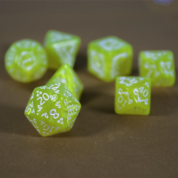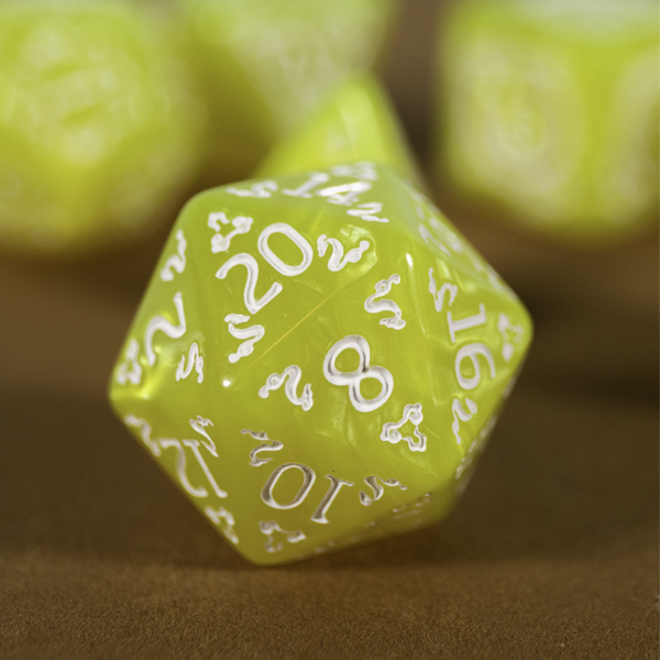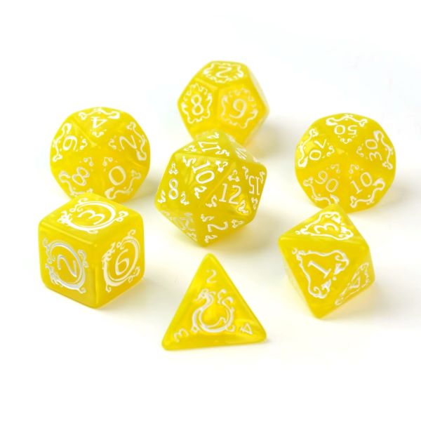 Each die in this set features a unique dragon scale engraving over a luminous yellow pearl marble effect, blending mythic style with practical design. The high-contrast numbering ensures fast readability during intense gameplay, while the tactile feel gives a sense of weight and quality in every roll.