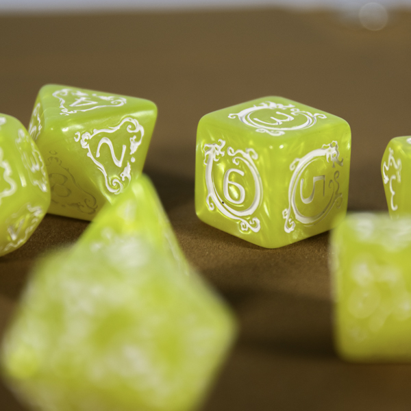 Yellow Pearl Marble Dragon Pattern – Polyhedral Dice Set – RPG Dice